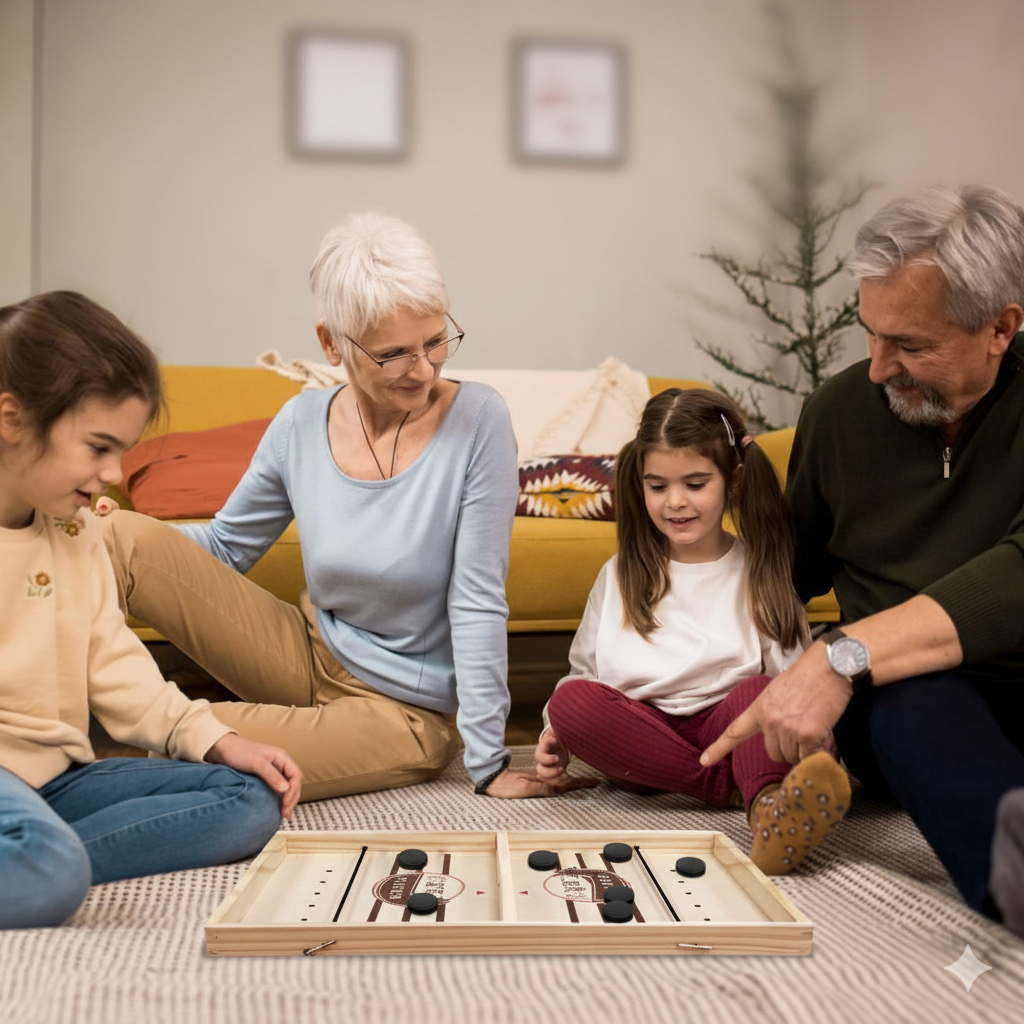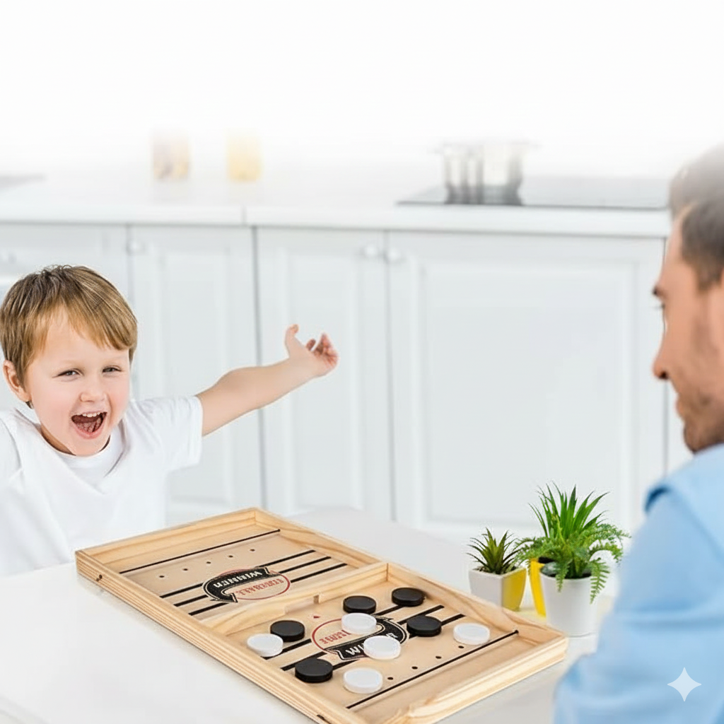 Launch pucks with an elastic-powered slingshot and race to clear your side first. The action is fast, exciting, and perfect for family fun. -